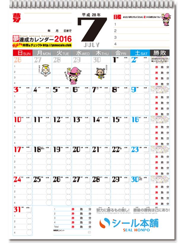 夢と4つの目標を宣誓! アナタの夢と、それを叶えるための4つの目標を決めて、目標に対する毎日の取組み状態を「勝」・「敗」・「引き分け」のシールで記録。週毎・月毎、そして1年間の集計表で、1年間の頑張りが目に見える!